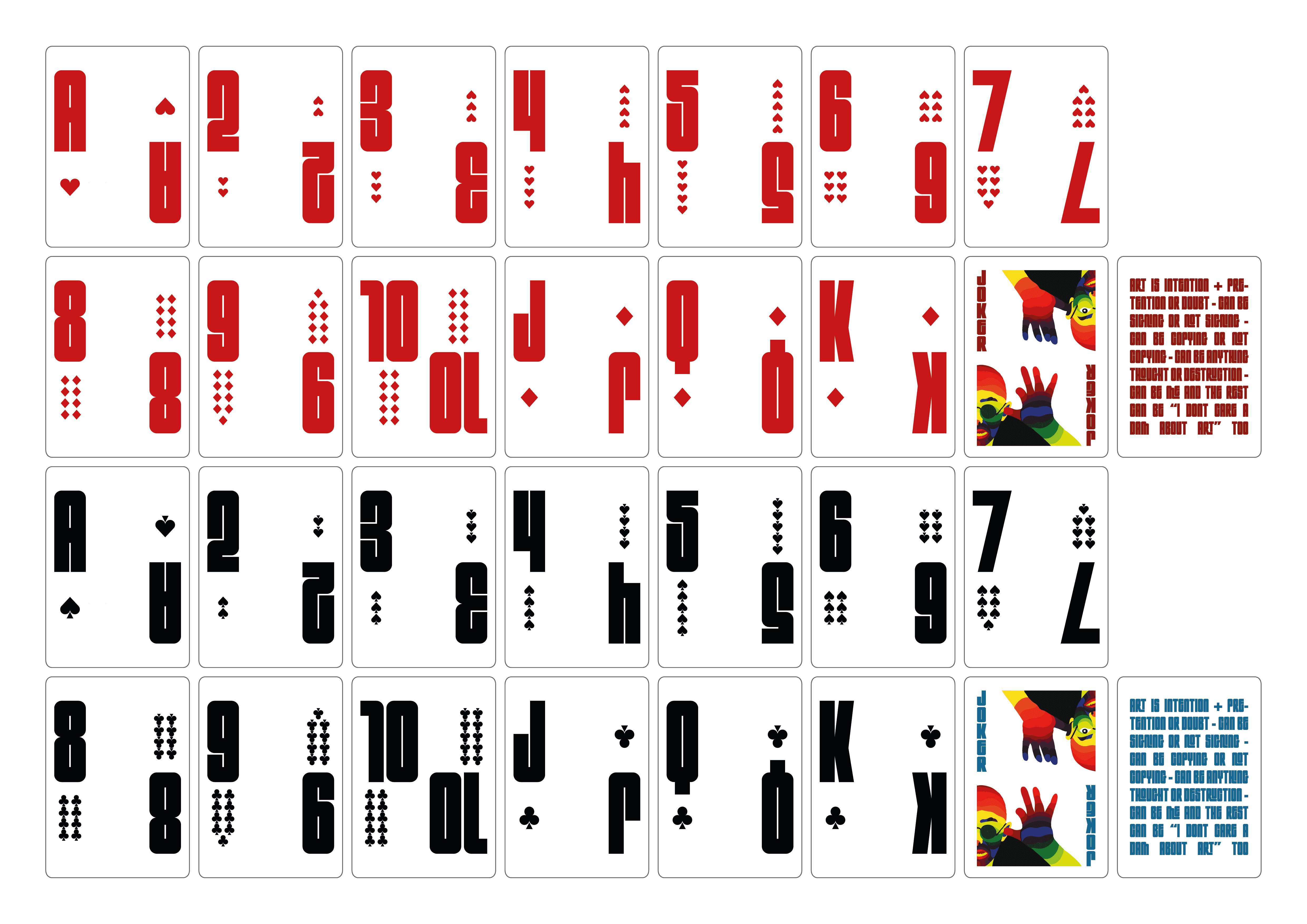 The rigid structure of numbers, suits and hierarchy becomes a playground for disruption — exaggerated typography, altered proportions and unexpected compositions challenge expectations while preserving playability.